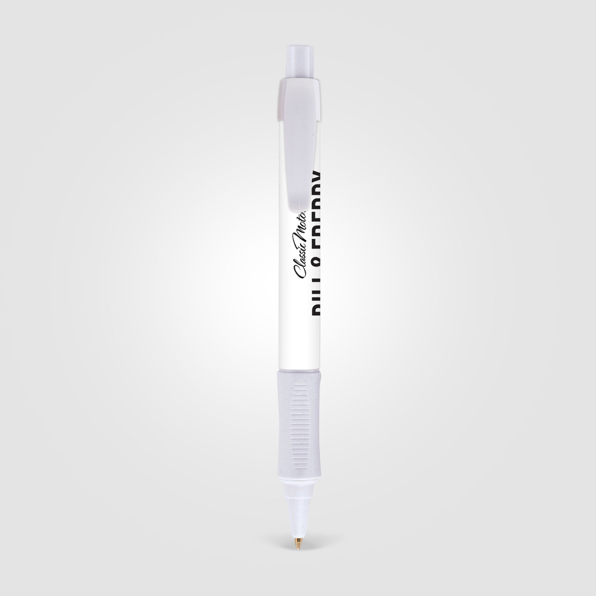 Great value, best-selling retractable plastic ballpoint pen with a wide body and ergonomic rubberised grip. Digitally printed in full colour, photo-quality 360° around the barrel. Supplied with blue or black Eversmooth (high density) writing ink. Please note: the clip is moveable, allowing for a full 360º branding area.